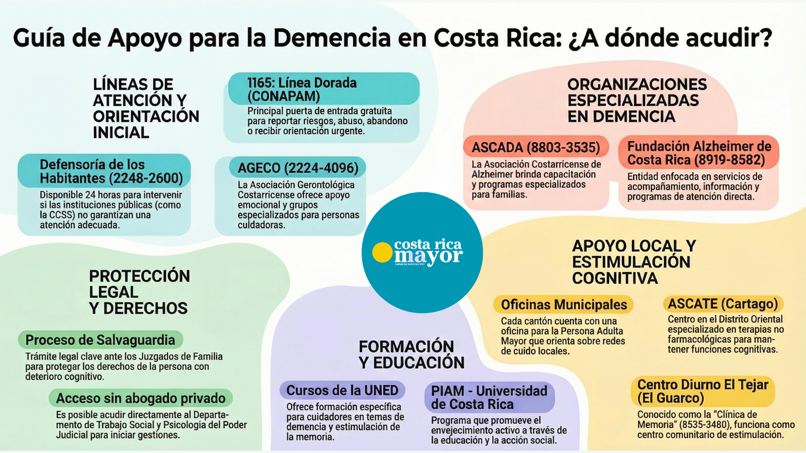 Las personas con demencia en Costa Rica tienen derechos exigibles hoy, no aspiraciones para el futuro. Tienen derecho a recibir atención médica oportuna y especializada, a ser protegidas contra toda forma de violencia o abuso patrimonial, y a participar —dentro de sus posibilidades— en las decisiones sobre su salud y su vida. Tienen derecho a información clara sobre su condición, a mantener su independencia el mayor tiempo posible y a permanecer en su entorno familiar y comunitario. Tienen también derecho a no ser discriminadas por edad o condición cognitiva, a que su historia de vida sea respetada y a acceder a tratamientos, terapias y cuidados de calidad en la red pública.