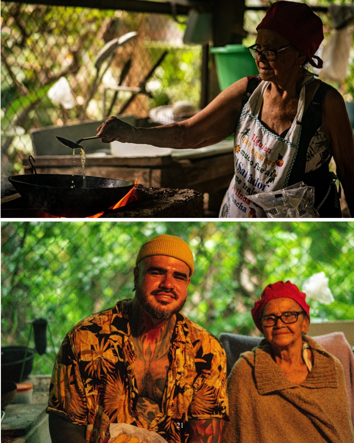 Doña Clementina llegó desde Nicaragua a los doce años, tras la pérdida de su madre. En su madrastra, Doña Esmeralda, encontró a la primera maestra de cocina de su vida. Sus buñuelos de yuca y queso —que en Semana Santa se vendían antes de freírse, de tanto que la gente los buscaba— tienen hoy un valor que va más allá del sabor: son el testimonio de que una mujer inmigrante y en duelo puede reconstruir su vida alrededor de un fogón. El libro no romantiza ese pasado: Doña Clementina ya no puede usar el fogón porque el humo le hace daño. Lo mira de lejos. Esa imagen —una abuela contemplando su propio fogón sin poder encenderlo— condensa toda la urgencia del proyecto.